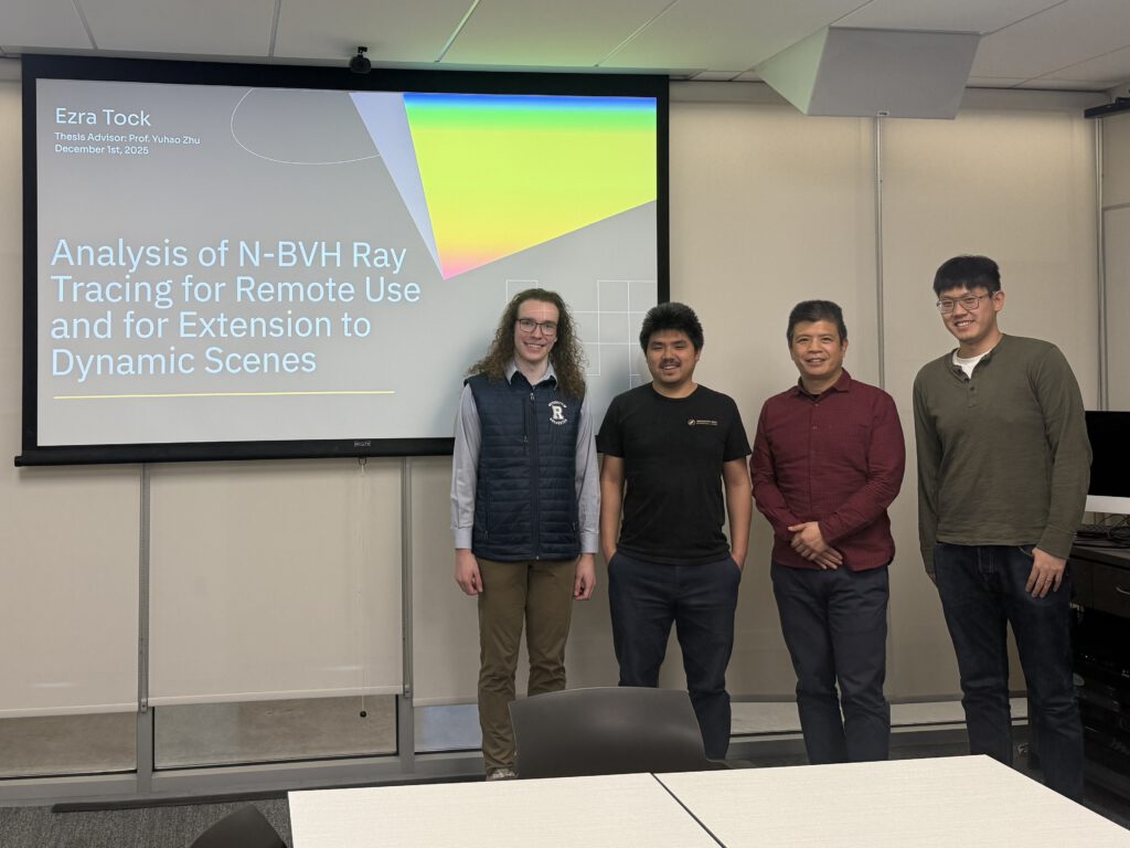 For my research topic, I investigated a neural ray tracing acceleration structure developed in 2024 by Phillip Weier and colleagues called N-BVH. When I was initially looking for a professor to advise my thesis, I was struck by the preface of Prof. Yuhao Zhu’s textbook, “Foundations in Visual Computing”, because I’ve always been passionate about visual media like dance, and his description of visual computing seemed to be the perfect intersection between visual media and computer science. Hence, we began emailing back and forth, he agreed to be my thesis advisor, and he told me about a research idea that he had never fully explored: using neural networks to accelerate bounding volume hierarchies (BVHs) in ray tracing. I began investigating the idea, with the help of Prof. Yuhao to figure out which research papers would be interesting to consider, and eventually, I came across Weier’s NBVH. With my learned grasp of the current literature’s progress on using neural networks to accelerate ray tracing, NBVH seemed like an ideal representative work to conduct a deeper analysis on. In addition, breaking down an algorithm like NBVH, doing analysis on what key bottlenecks exist, and determining what implications it would have for future neural ray tracing work seemed like the appropriate scope for an undergraduate thesis. Hence, I finalized this as my topic proposal, and I began to explore.